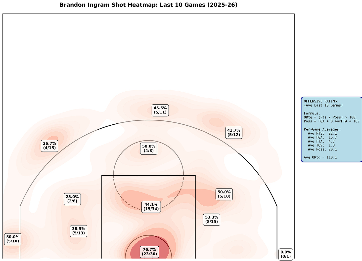 TL;DR: Brandon Ingram shoots 67.5% at the rim, 40.5% from three over his last 15 games, and 53.9% eFG% overall. His ORtg climbed from 100.8 to 110.1 in his last 10 games. The “inefficient midrange merchant” label is lazy analysis. He’s not playing like it’s 2026 — he’s playing like it’s basketball.