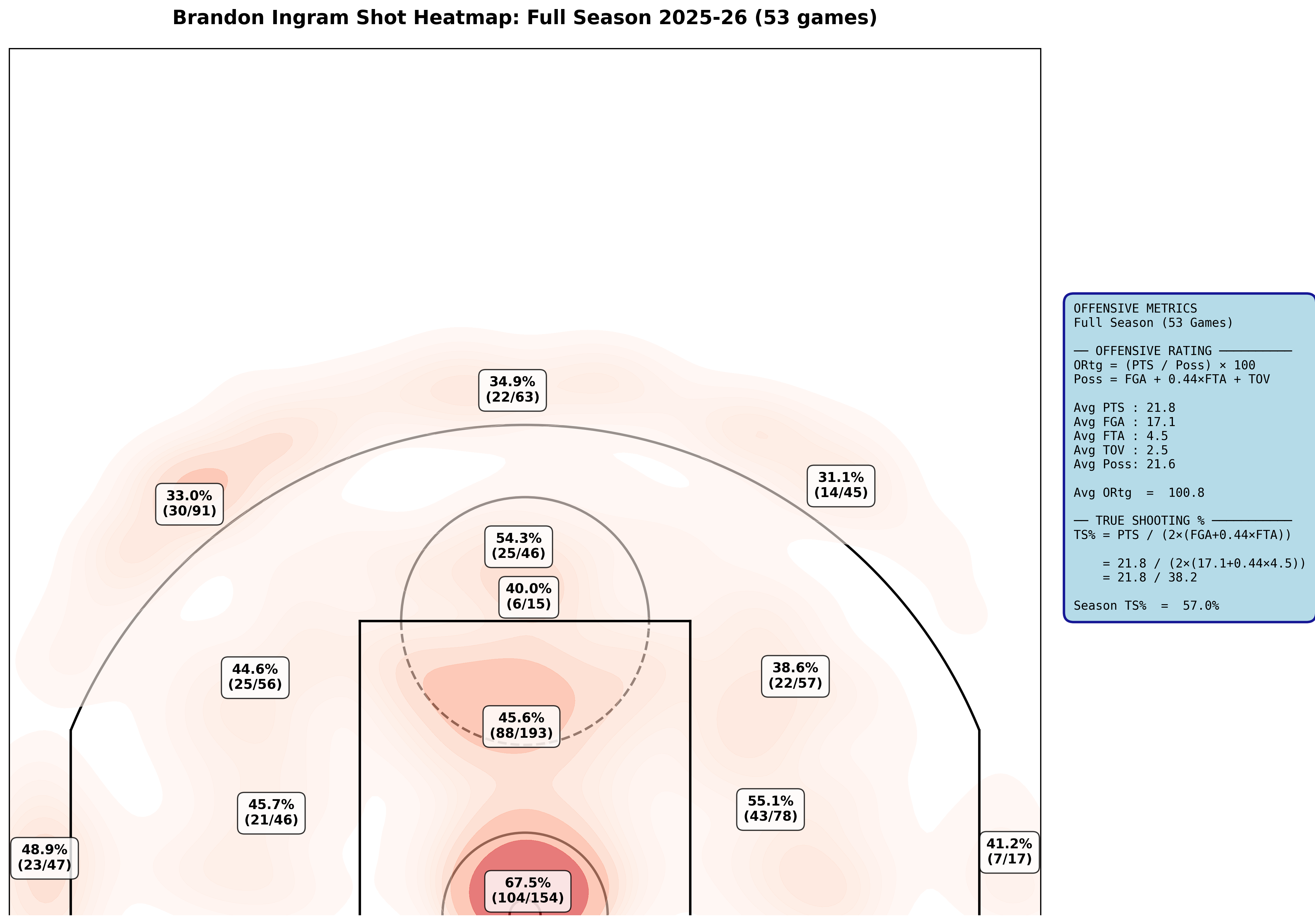 Look at Brandon Ingram’s full season heat map. The midrange is absolutely painted red: 88 attempts from one zone at 45.6%, 43 attempts from the right elbow at 55.1%, 25 from the top of the key at 54.3%. NBA 2K26 calls him a “Crafty Mid-Range Menace” for a reason.